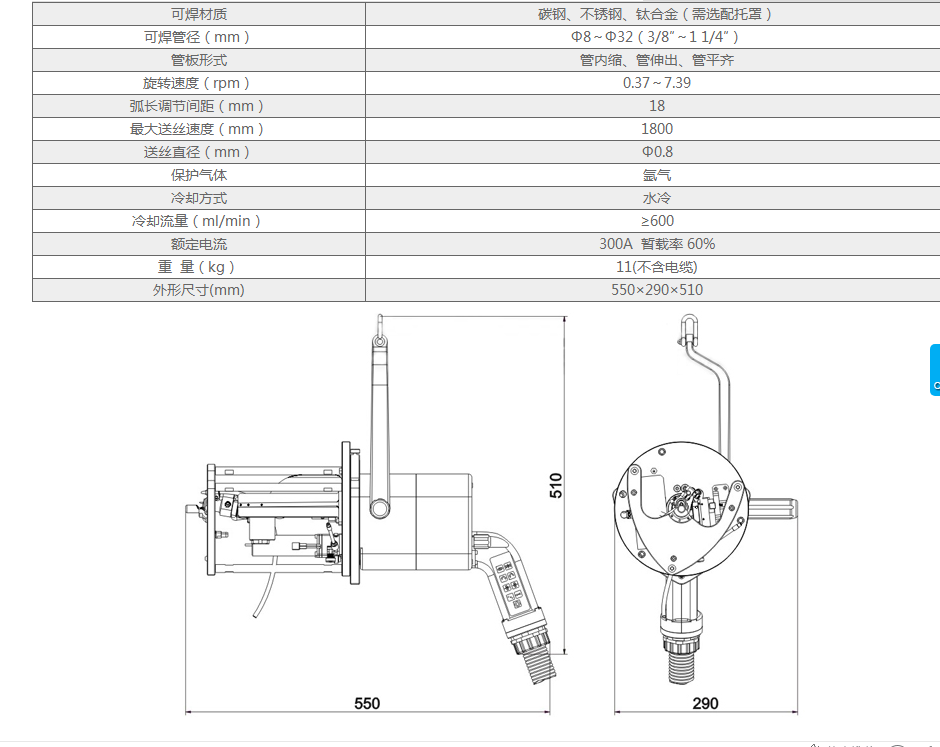 該焊機(jī)是專為小管徑管板全位置TIG焊接設(shè)計(jì)的專用焊槍,適用于小管外徑為8mm??珊附犹间?、不銹鋼等材質(zhì),適用于管內(nèi)縮、管平齊、管伸